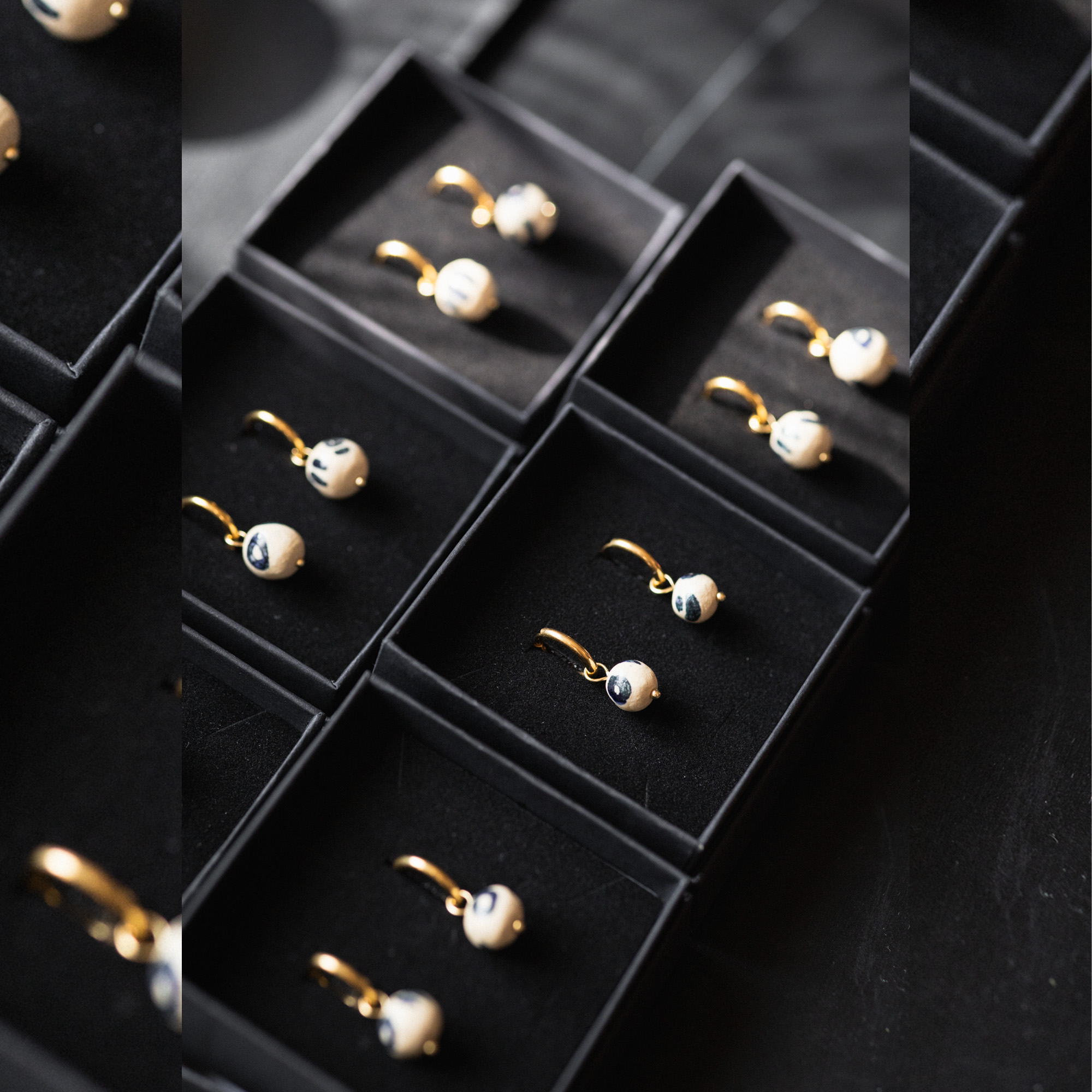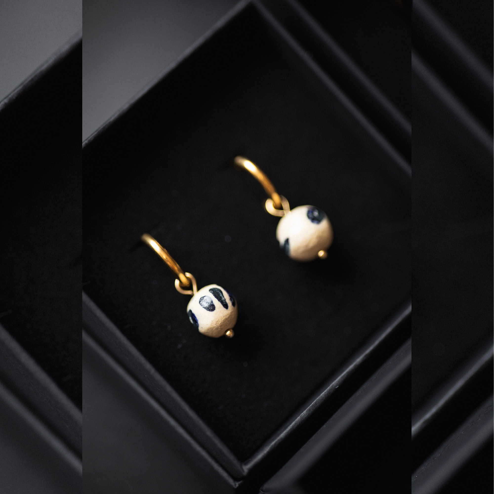 Handmade ceramic drop earrings – perfect for special occasions or as classic everyday jewellery. Each ceramic bead is handmade, hand-painted with cobalt oxide, glazed with transparent glaze and fired in a ceramic kiln. This process ensures that each pair is unique.